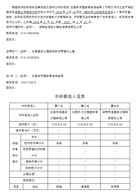 攸縣新市國家糧食儲備庫2萬噸大米加工生產(chǎn)線改建項目 招標投標信息公示表