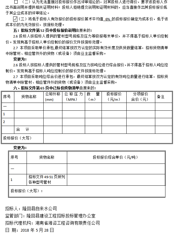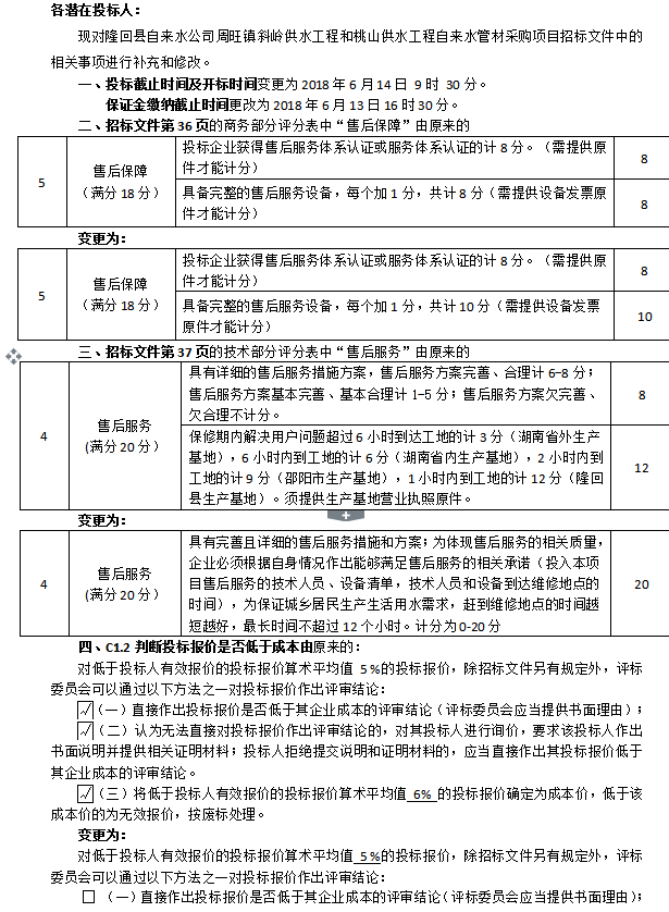 隆回縣自來(lái)水公司周旺鎮(zhèn)斜嶺供水工程和桃山供水工程 自來(lái)水管材采購(gòu)項(xiàng)目招標(biāo)文件修改及延期公告