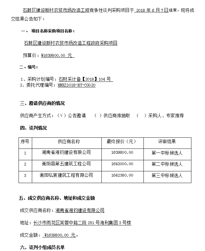石鼓區(qū)建設(shè)新村農(nóng)貿(mào)市場改造工程政府采購項目 競爭性談判成交結(jié)果公告