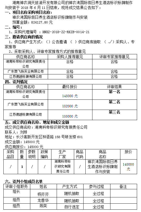神農(nóng)灣國際假日養(yǎng)生酒店標識標牌制作與安裝 競爭性談判成交公告