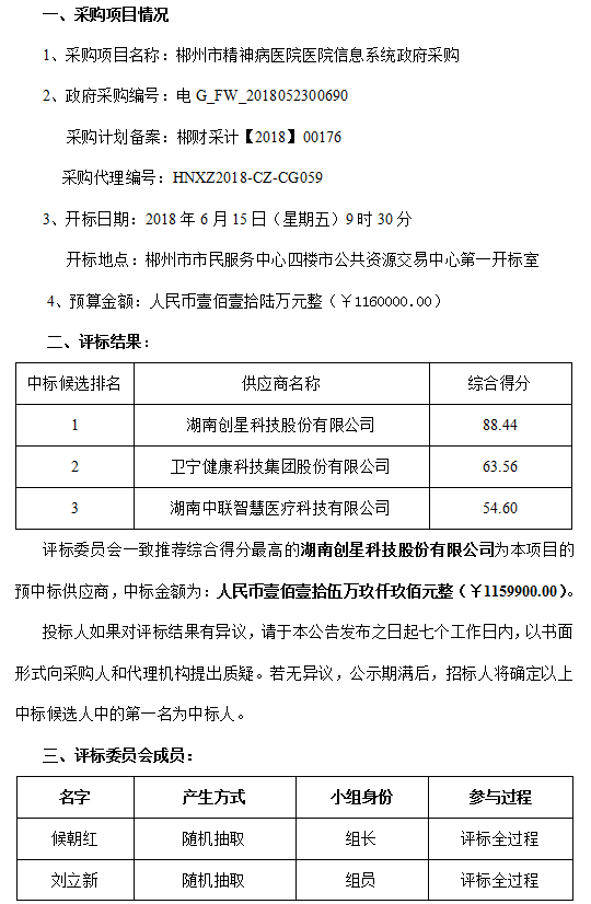 郴州市精神病醫(yī)院醫(yī)院信息系統(tǒng)政府采購(gòu) 中標(biāo)結(jié)果公示