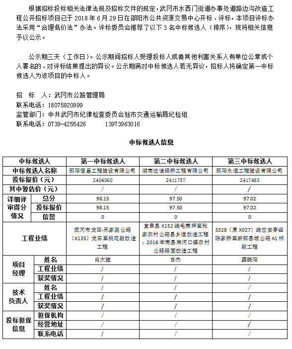 武岡市水西門街道辦事處道路邊溝改造工程 中標候選人公示