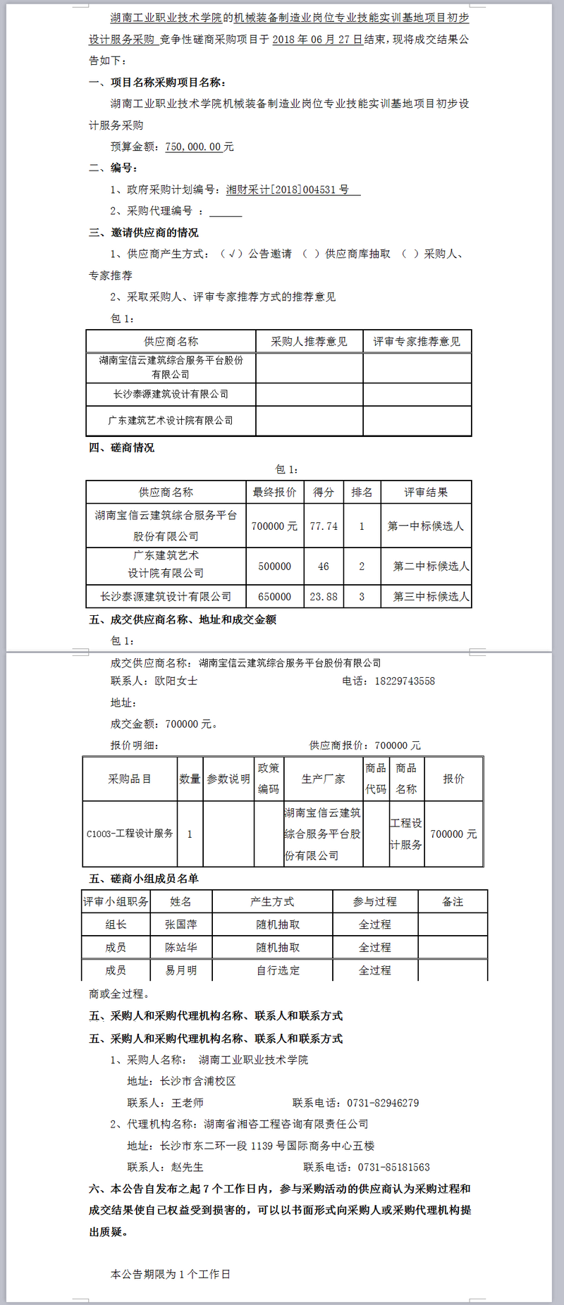 湖南工業(yè)職業(yè)技術(shù)學(xué)院機械裝備制造業(yè)崗位專業(yè)技能實訓(xùn)基地項目初步設(shè)計服務(wù)采購競爭性磋商成交公告