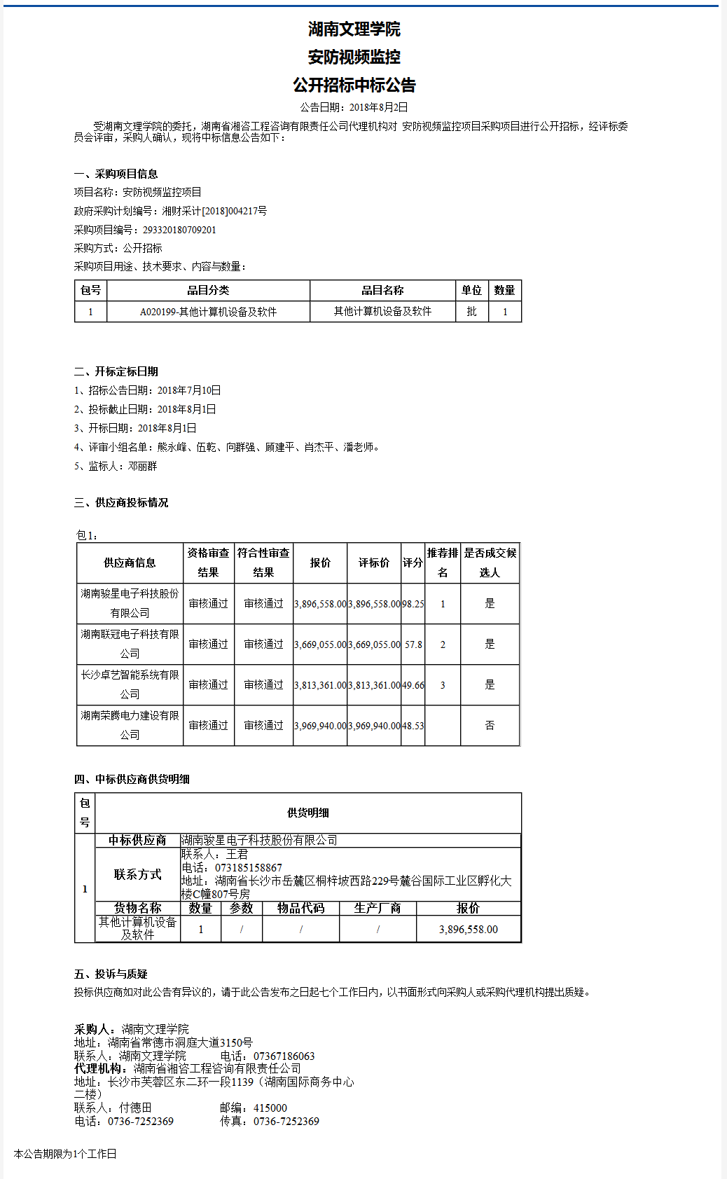 湖南文理學(xué)院安防視頻監(jiān)控公開招標(biāo)中標(biāo)公告