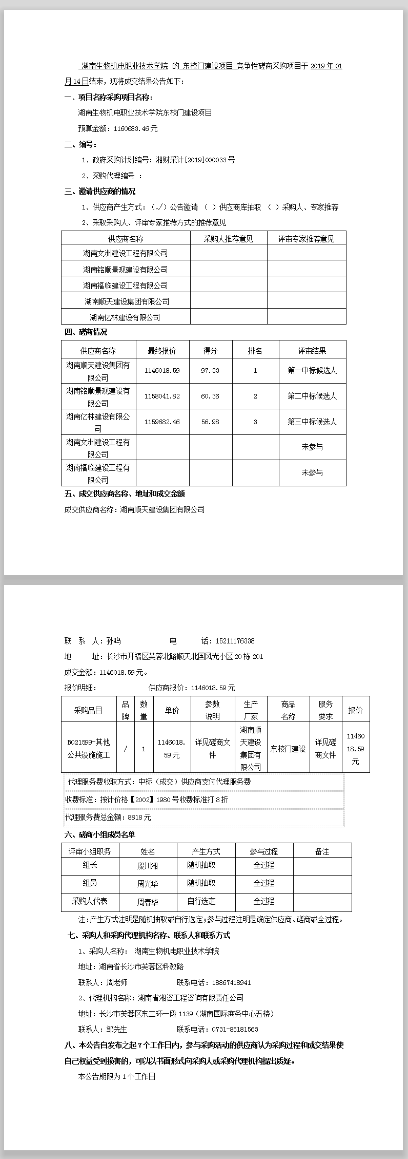 湖南生物機電職業(yè)技術學院東校門建設項目競爭性磋商成交公告