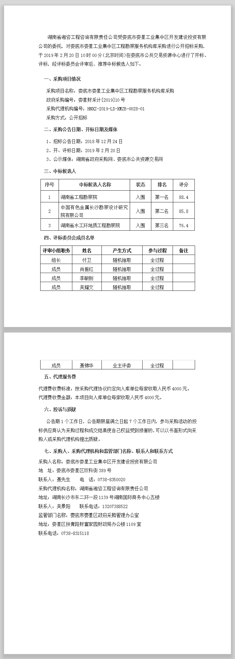 婁底市婁星工業(yè)集中區(qū)工程勘察服務(wù)機(jī)構(gòu)庫(kù)采購(gòu)公開招標(biāo)中標(biāo)公告