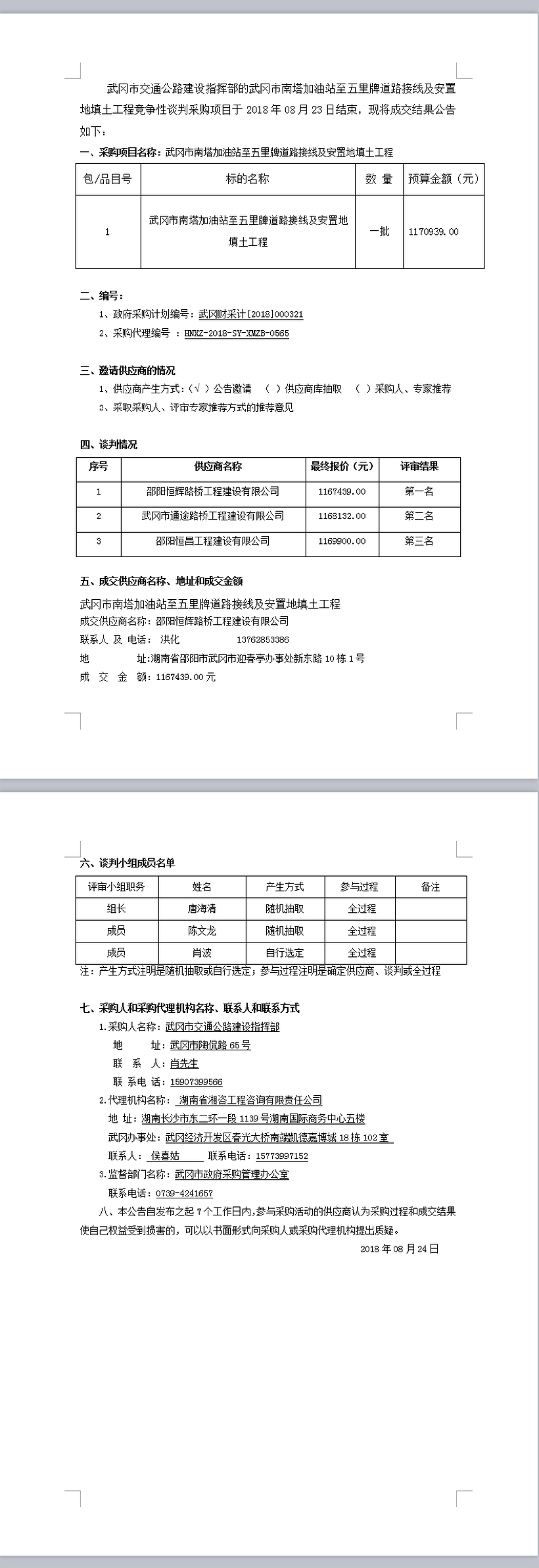 武岡市南塔加油站至五里牌道路接線及安置地填土工程競(jìng)爭(zhēng)性談判成交結(jié)果公告