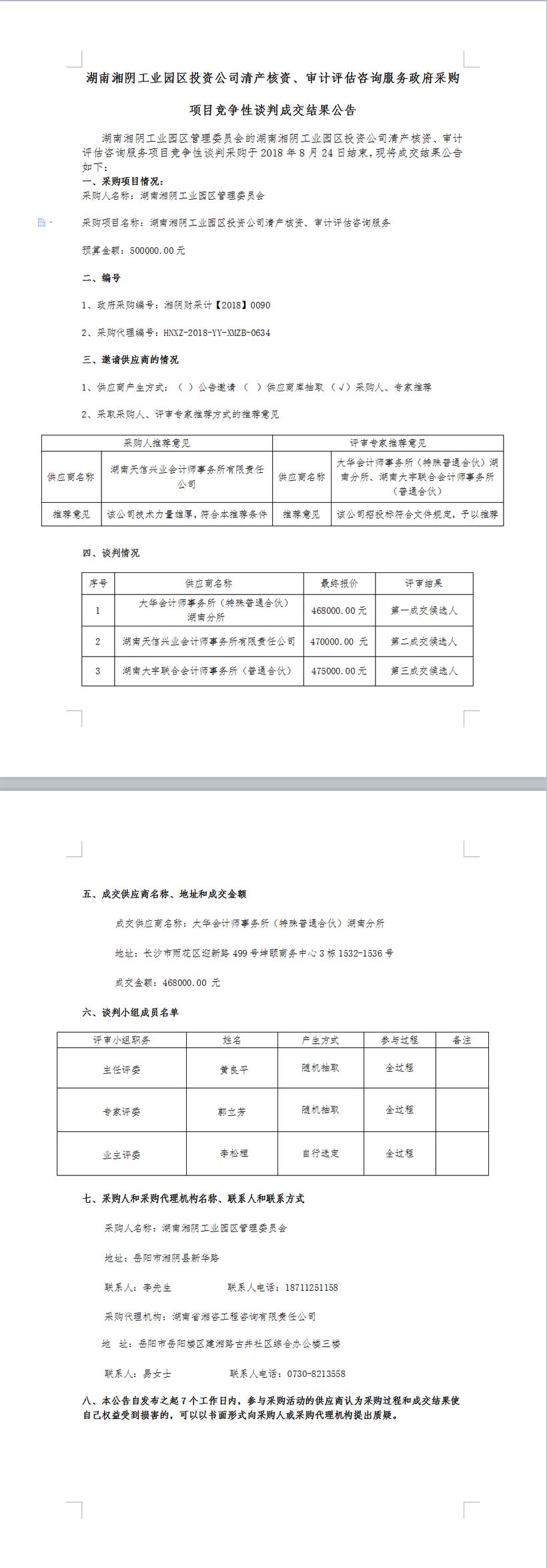 湖南湘陰工業(yè)園區(qū)投資公司清產(chǎn)核資、審計(jì)評(píng)估咨詢服務(wù)政府采購(gòu) 項(xiàng)目競(jìng)爭(zhēng)性談判成交結(jié)果公告