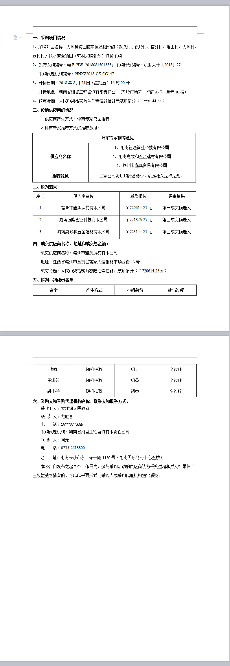 大坪鎮(zhèn)貧困集中區(qū)基礎(chǔ)設(shè)施(溪頭村、祝嶺村、官路村、堆山村、大坪村、歐村村)飲水安全項目(輔材采購部分)詢價采購成交公告