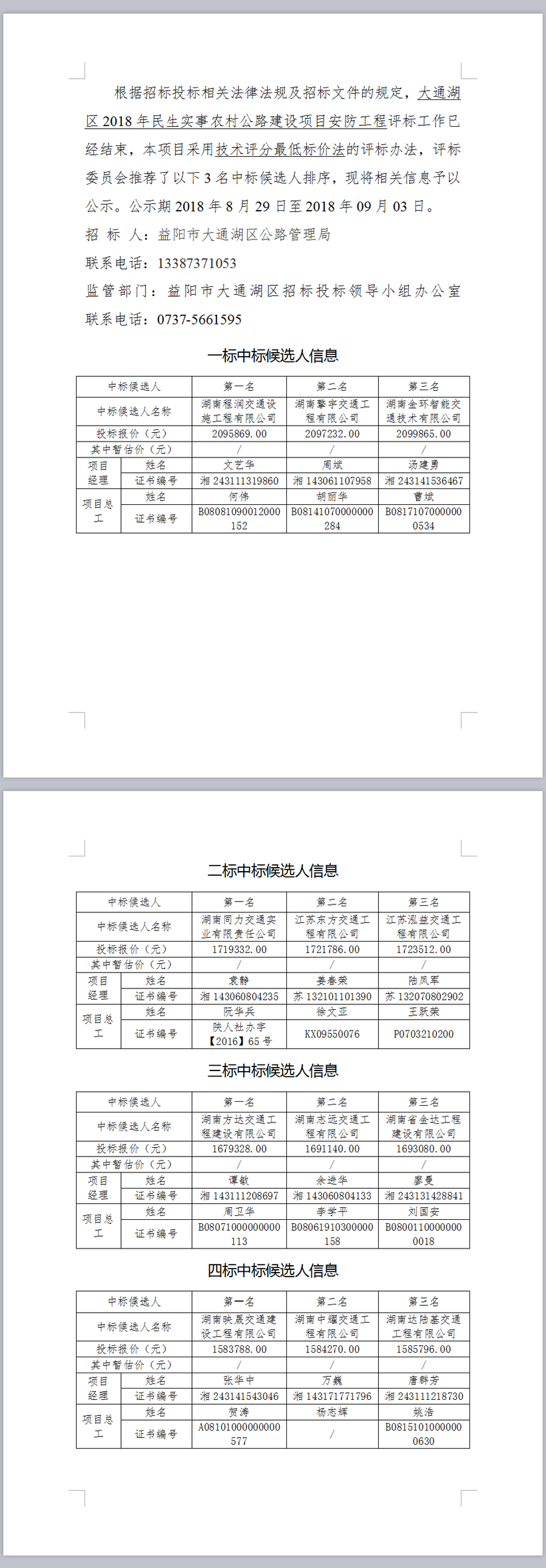 大通湖區(qū)2018年民生實事農(nóng)村公路建設項目安防工程中標候選人公示