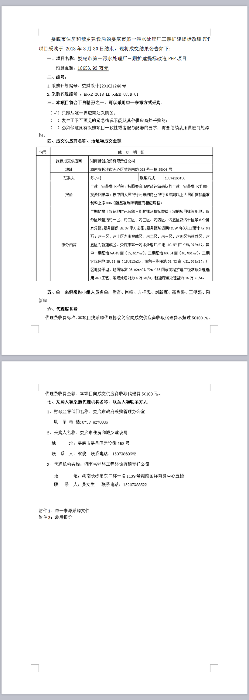 婁底市第一污水處理廠三期擴(kuò)建及提標(biāo)改造PPP項目單一來源成交公告