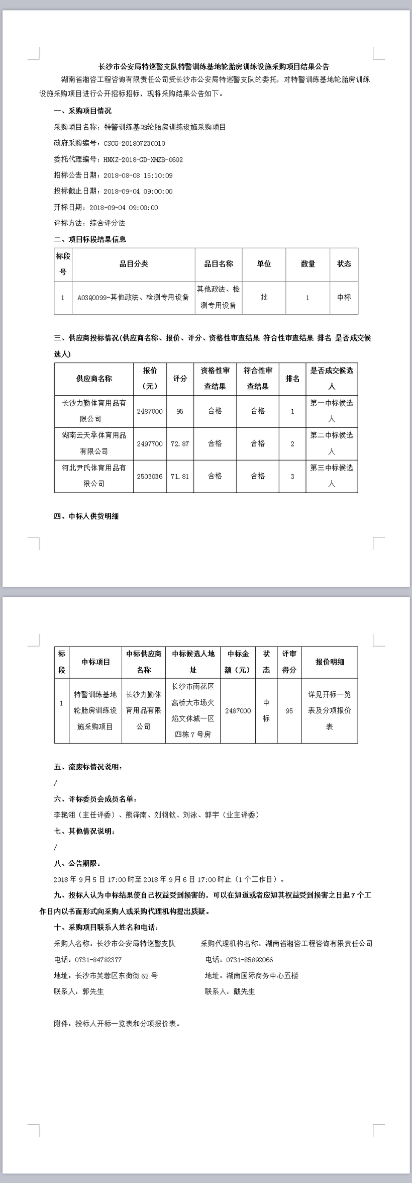 長(zhǎng)沙市公安局特巡警支隊(duì)特警訓(xùn)練基地輪胎房訓(xùn)練設(shè)施采購(gòu)項(xiàng)目結(jié)果公告