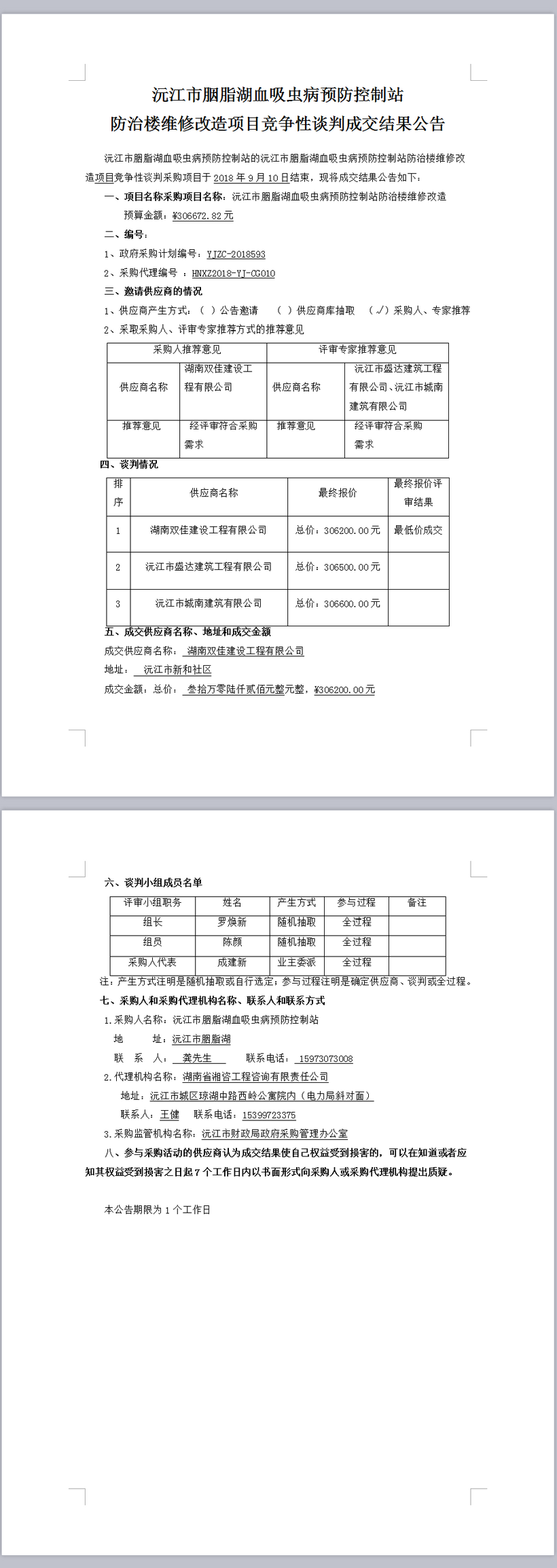 沅江市胭脂湖血吸蟲病預(yù)防控制站防治樓維修改造項(xiàng)目競(jìng)爭(zhēng)性談判成交結(jié)果公告