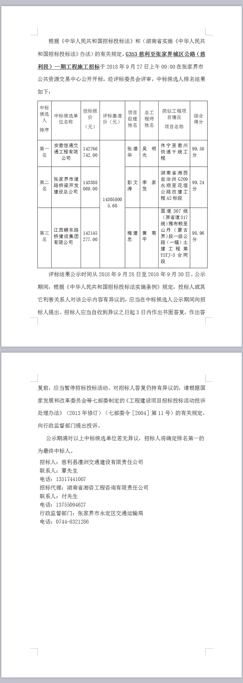 G353慈利至張家界城區(qū)公路(慈利段)一期工程施工招標中標候選單位公示
