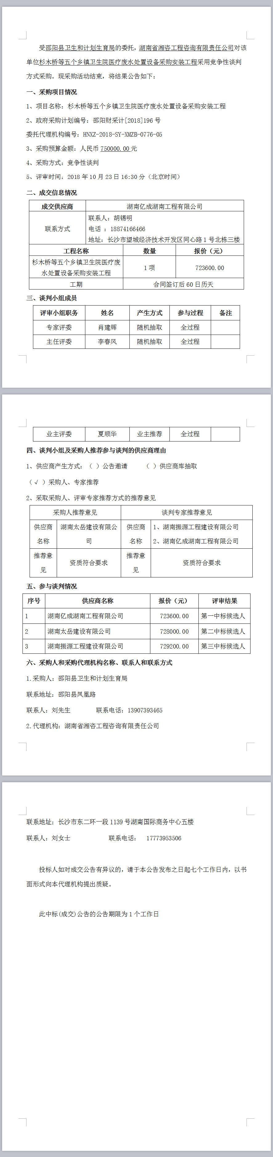 杉木橋等五個鄉(xiāng)鎮(zhèn)衛(wèi)生院醫(yī)療廢水處置設(shè)備采購安裝工程談判成交公告