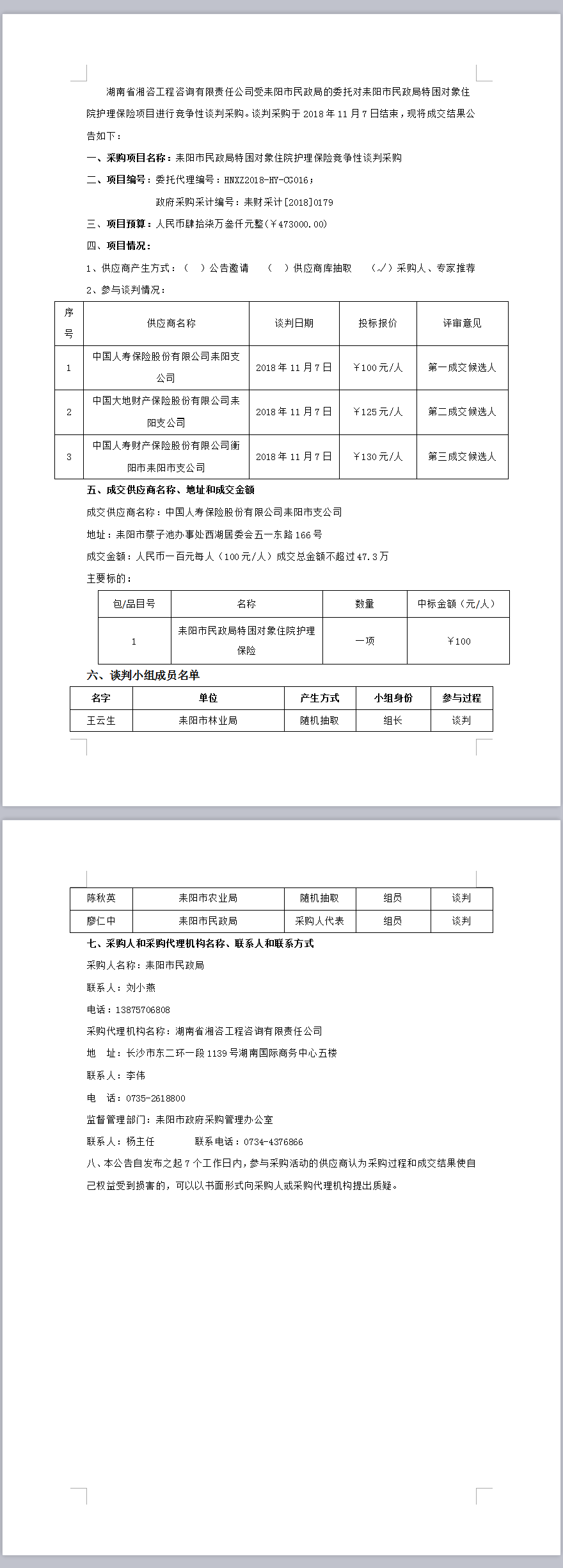 耒陽市民政局特困對(duì)象住院護(hù)理保險(xiǎn)競(jìng)爭(zhēng)性談判采購(gòu)成交公告