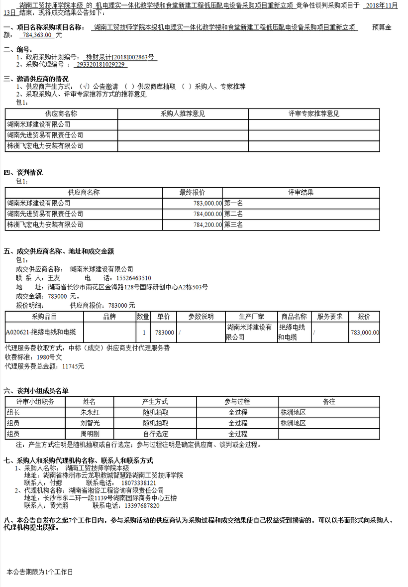 湖南工貿(mào)技師學(xué)院本級(jí)機(jī)電理實(shí)一體化教學(xué)樓和食堂新建工程低壓配電設(shè)備采購項(xiàng)目競爭性談判成交公告