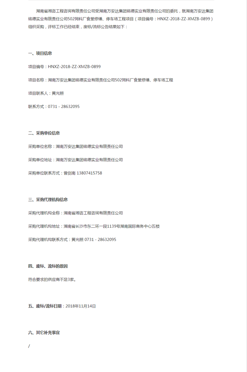 湖南萬安達(dá)集團(tuán)銘德實業(yè)有限責(zé)任公司502飼料廠食堂修繕、停車場工程廢標(biāo)公告/流標(biāo)公告