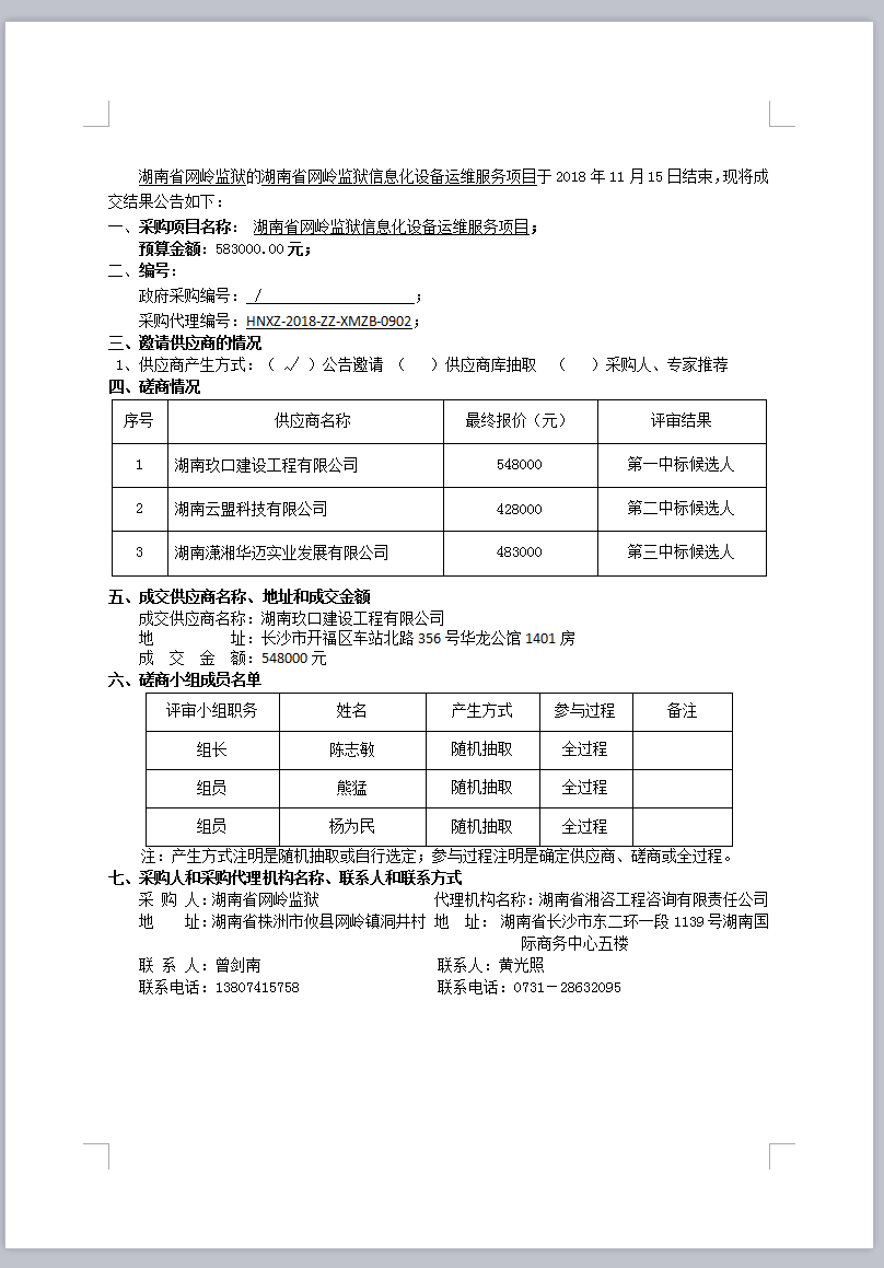 湖南省網(wǎng)嶺監(jiān)獄信息化設備運維服務項目成交結果公告