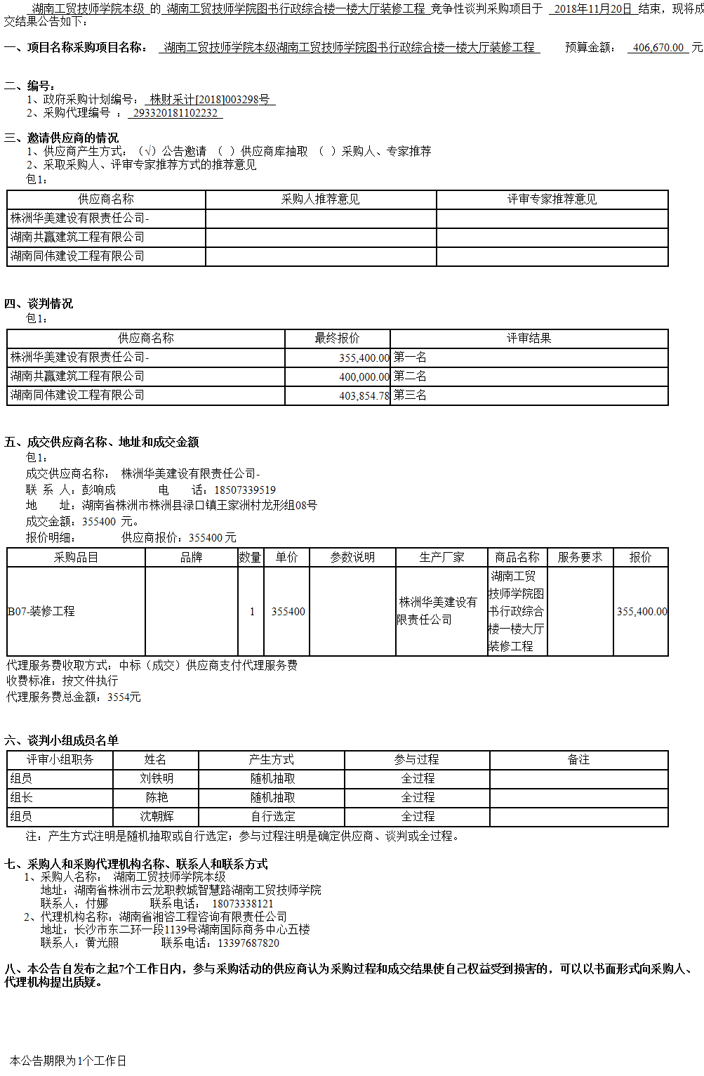 湖南工貿技師學院圖書行政綜合樓一樓大廳裝修工程成交結果公告