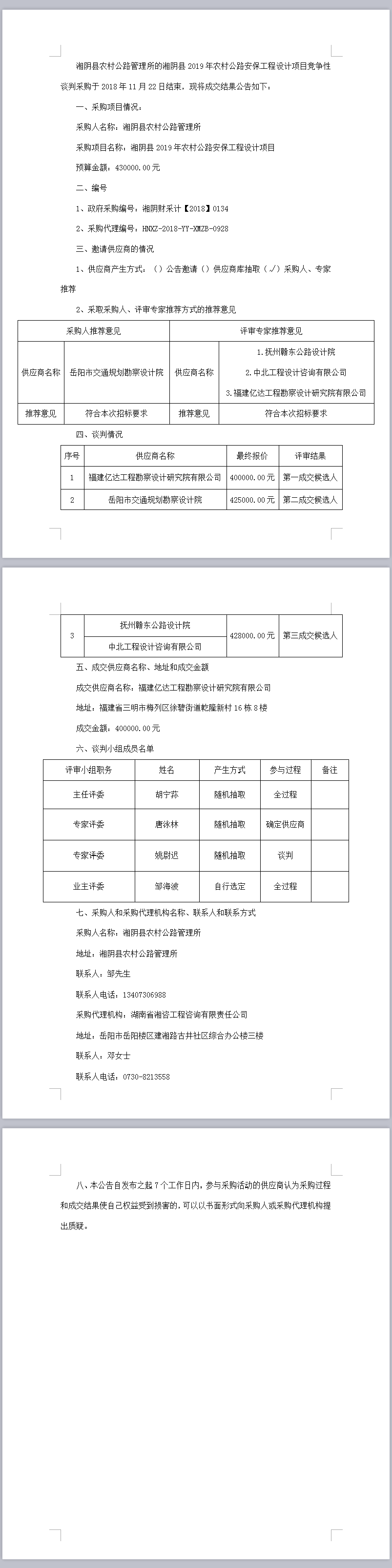 湘陰縣2019年農(nóng)村公路安保工程設(shè)計(jì)項(xiàng)目競(jìng)爭(zhēng)性談判成交結(jié)果公告