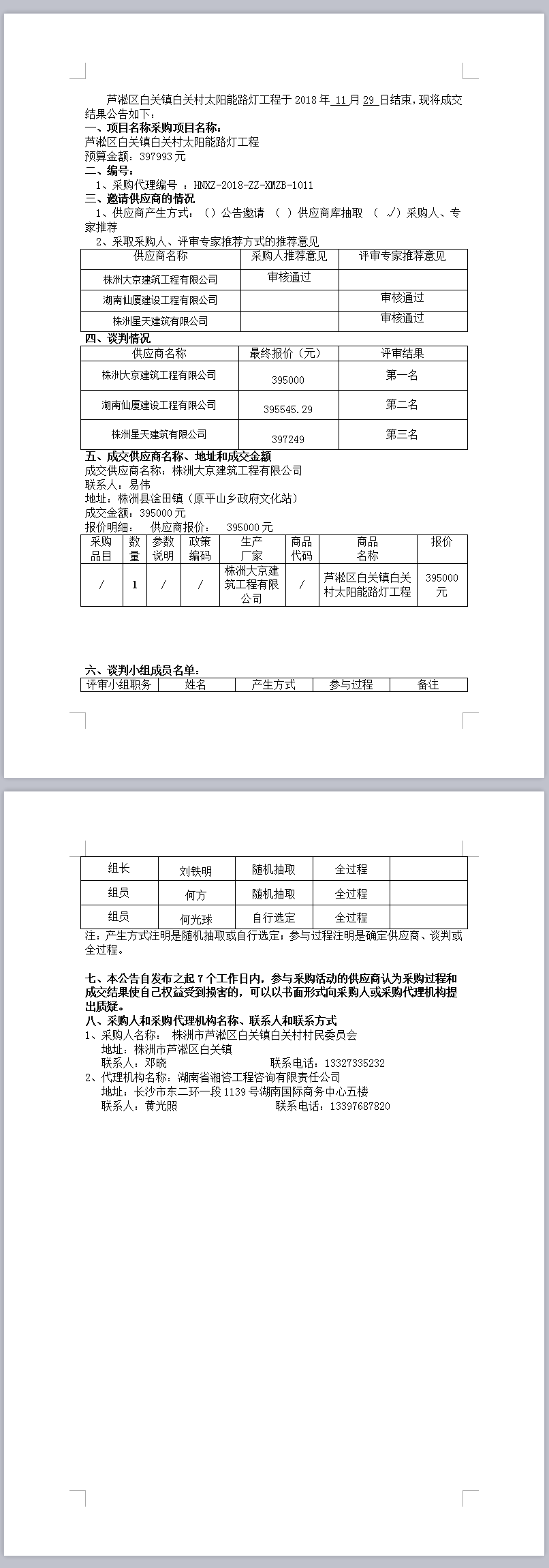 蘆淞區(qū)白關(guān)鎮(zhèn)白關(guān)村太陽能路燈工程 競爭性談判成交公告