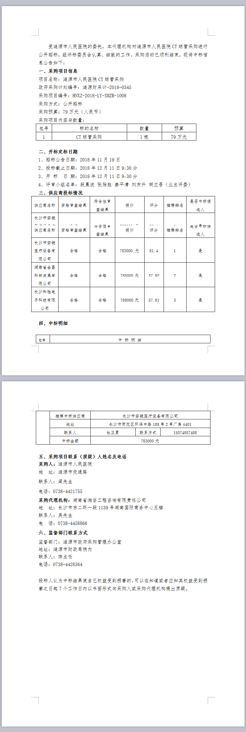 漣源市人民醫(yī)院CT球管采購中標結(jié)果公告