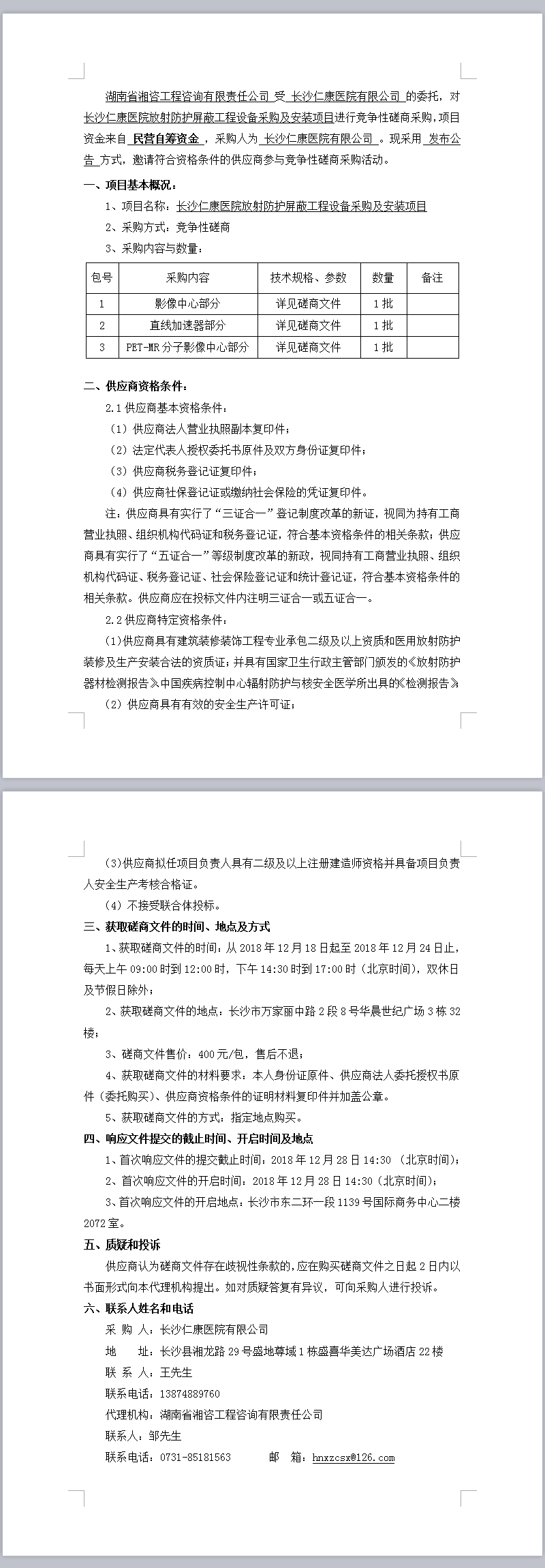 長沙仁康醫(yī)院放射防護屏蔽工程設備采購及安裝項目磋商邀請公告