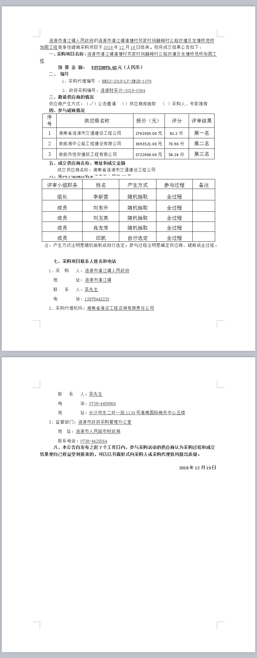 漣源市湄江鎮(zhèn)湄塘村蘇家村祝融峰村公路改建及龍?zhí)翗蛭蚣庸坦こ谈?jìng)爭(zhēng)性磋商成交結(jié)果公告