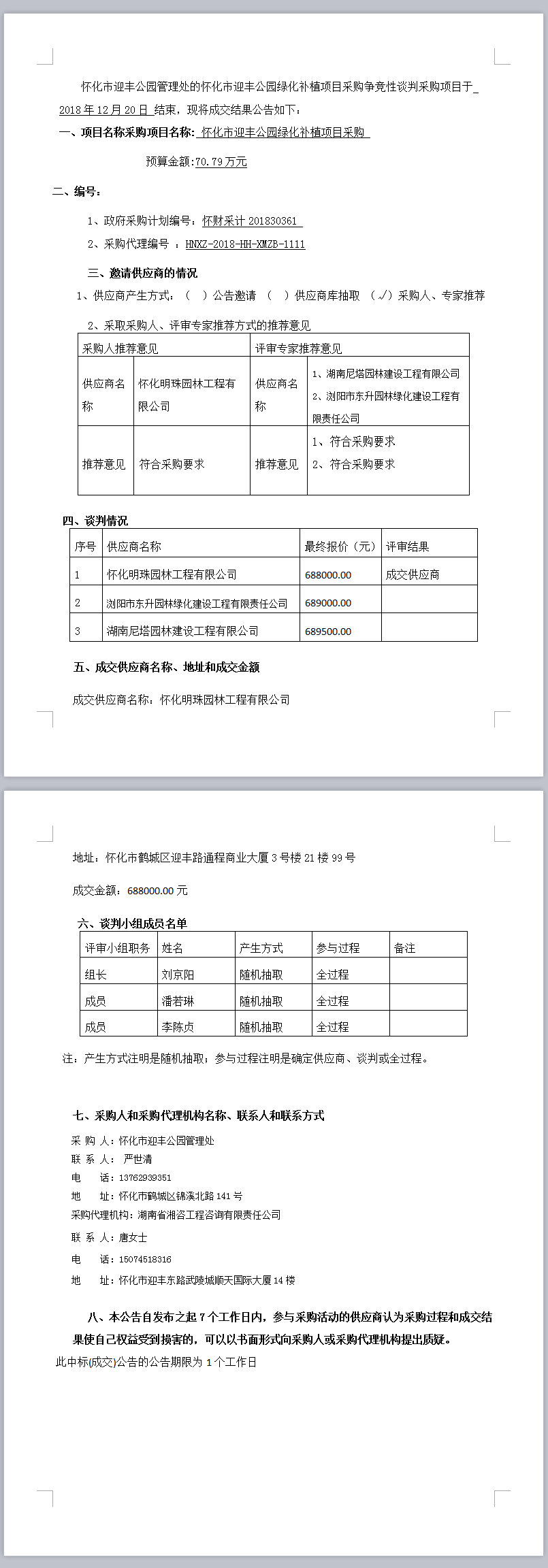懷化市迎豐公園綠化補植項目采購談判成交公告