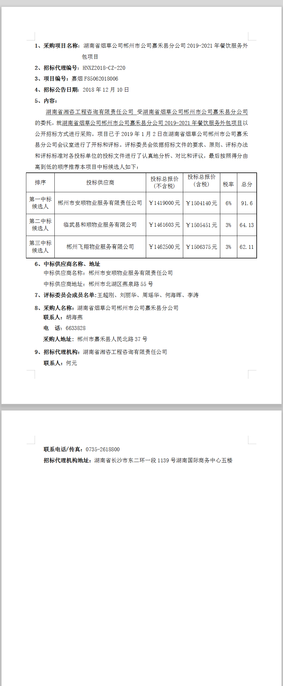 湖南省煙草公司郴州市公司嘉禾縣分公司2019-2021年餐飲服務(wù)外包項(xiàng)目中標(biāo)公告