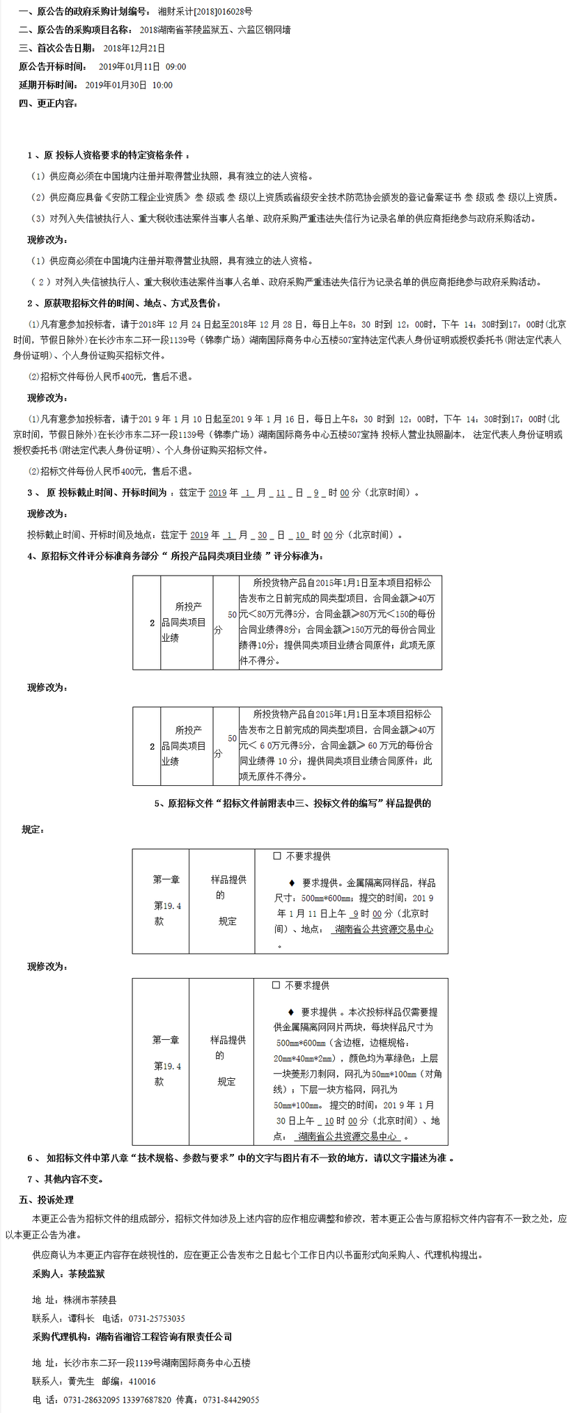 茶陵監(jiān)獄2018湖南省茶陵監(jiān)獄五、六監(jiān)區(qū)鋼網(wǎng)墻項(xiàng)目公開招標(biāo)更正公告