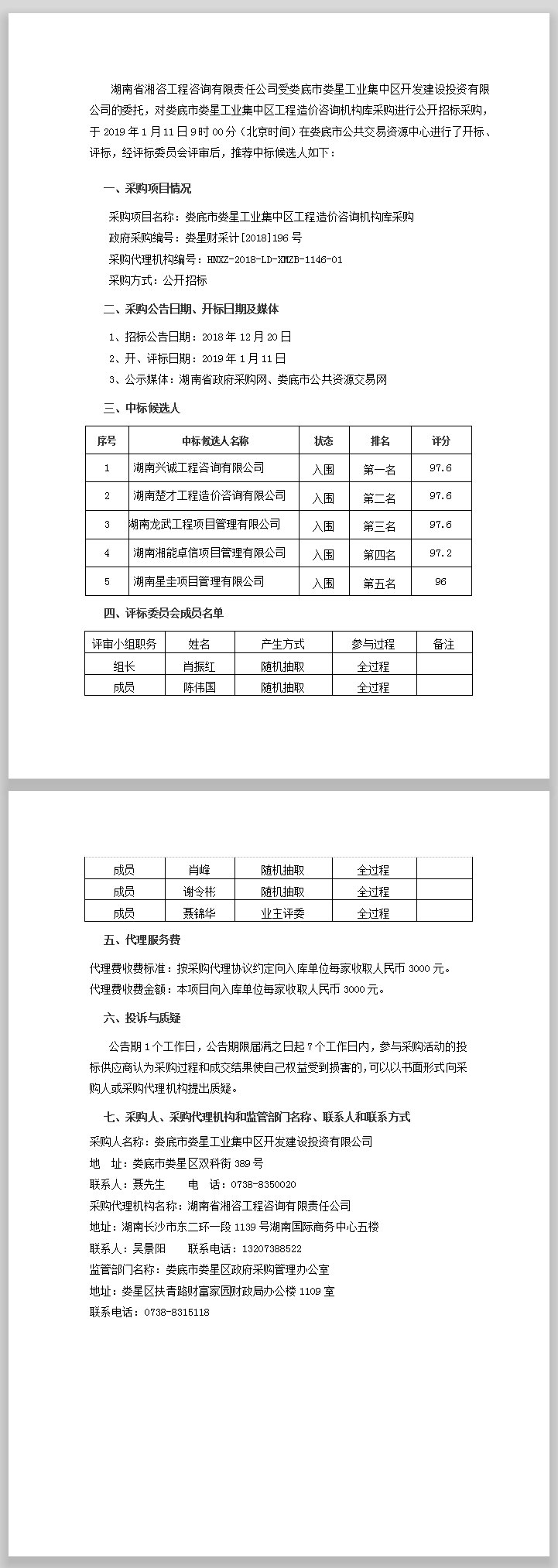 婁底市婁星工業(yè)集中區(qū)工程造價咨詢機構庫采購公開招標中標公告