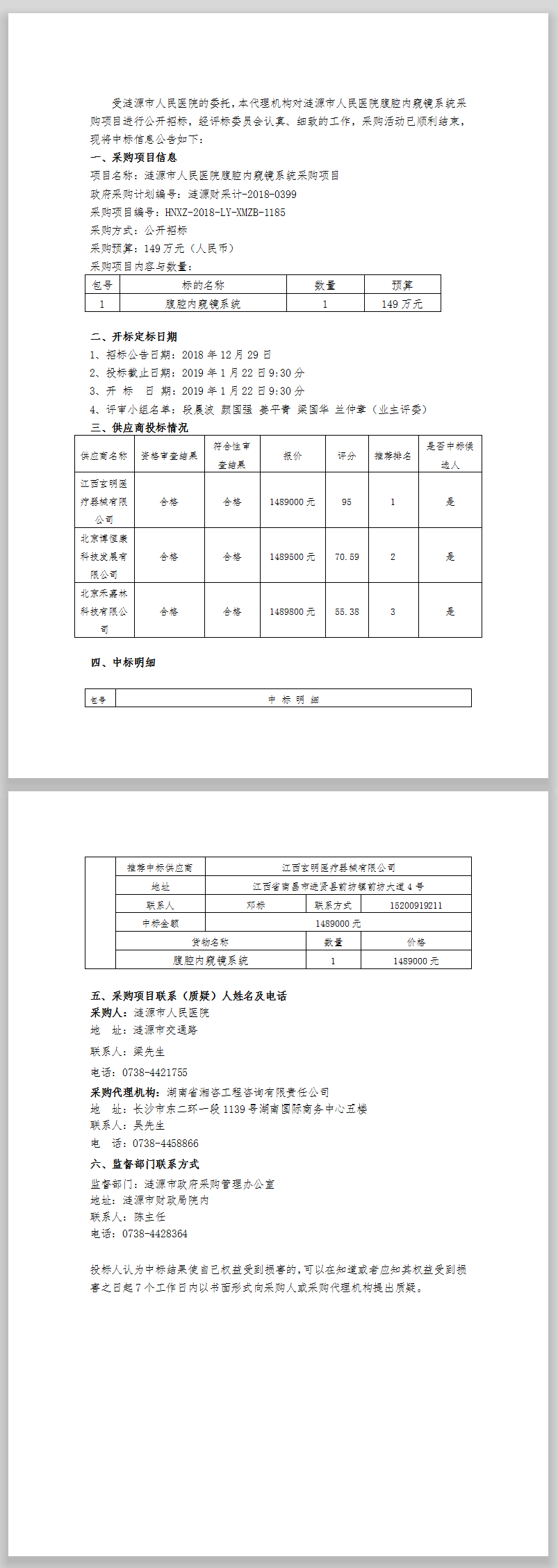 漣源市人民醫(yī)院腹腔內(nèi)窺鏡系統(tǒng)采購項目中標(biāo)結(jié)果公告