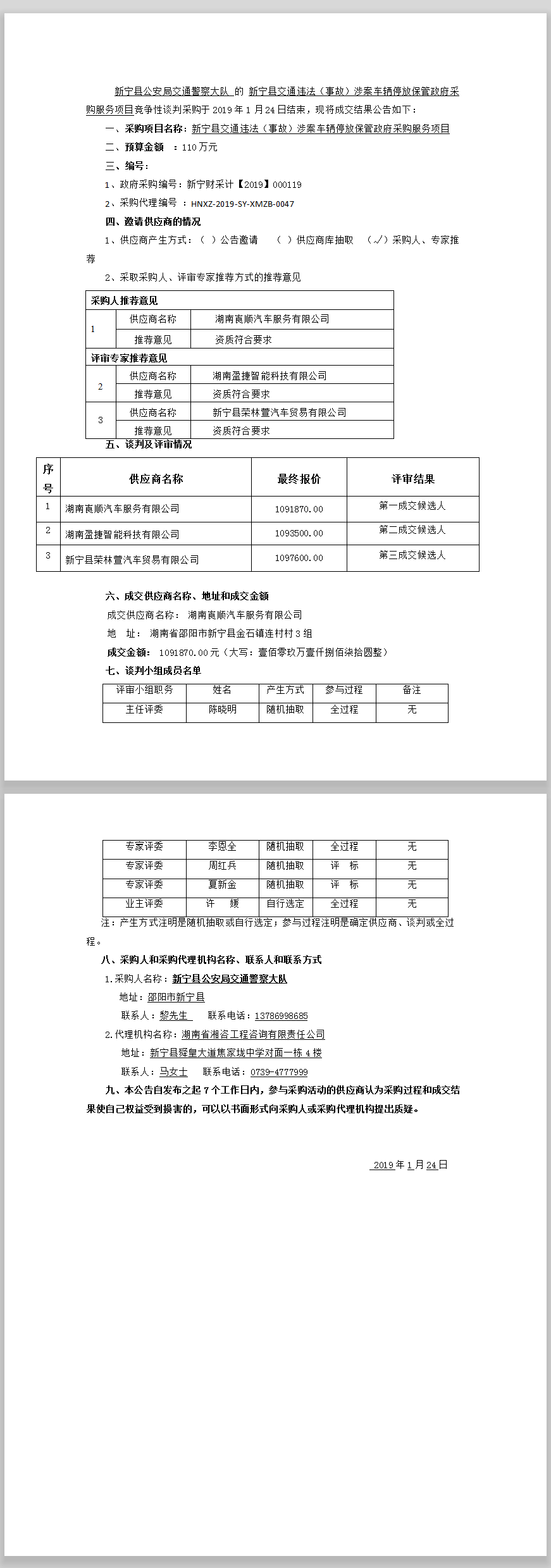 新寧縣交通違法(事故)涉案車輛停放 保管政府采購服務項目 競爭性談判成交結果公告