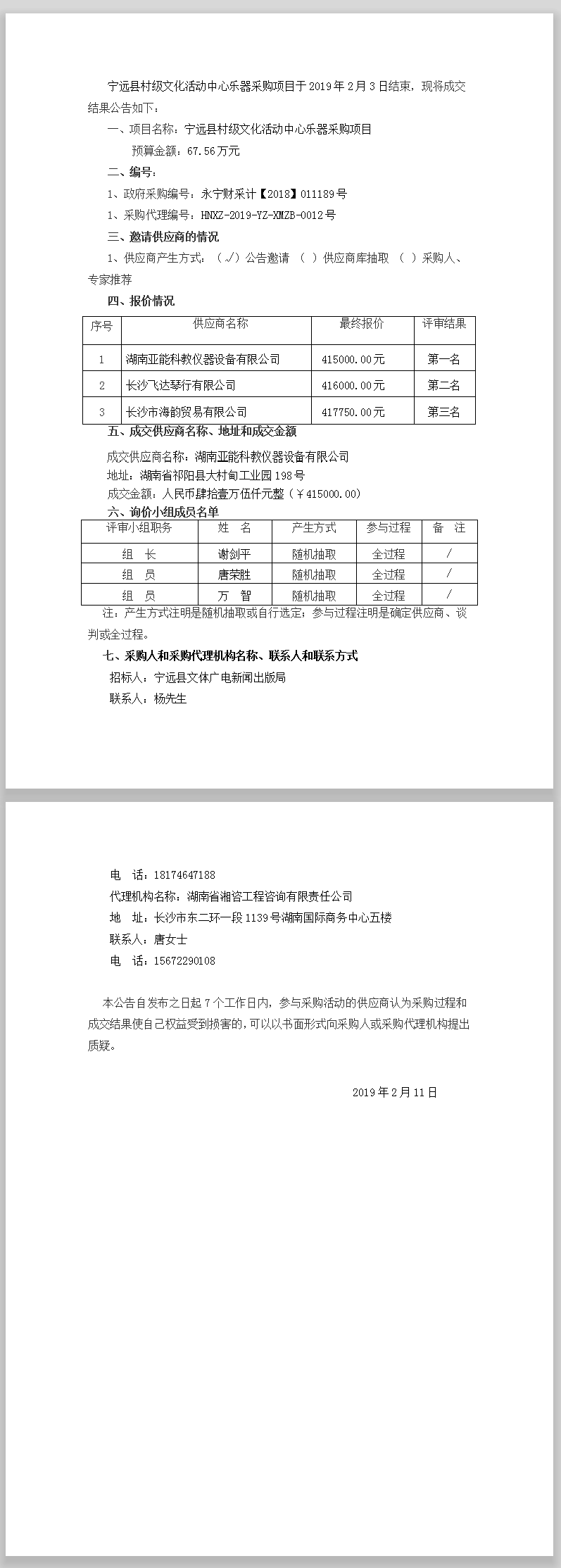 寧遠(yuǎn)縣村級文化活動中心樂器采購項(xiàng)目 詢價采購成交結(jié)果公告