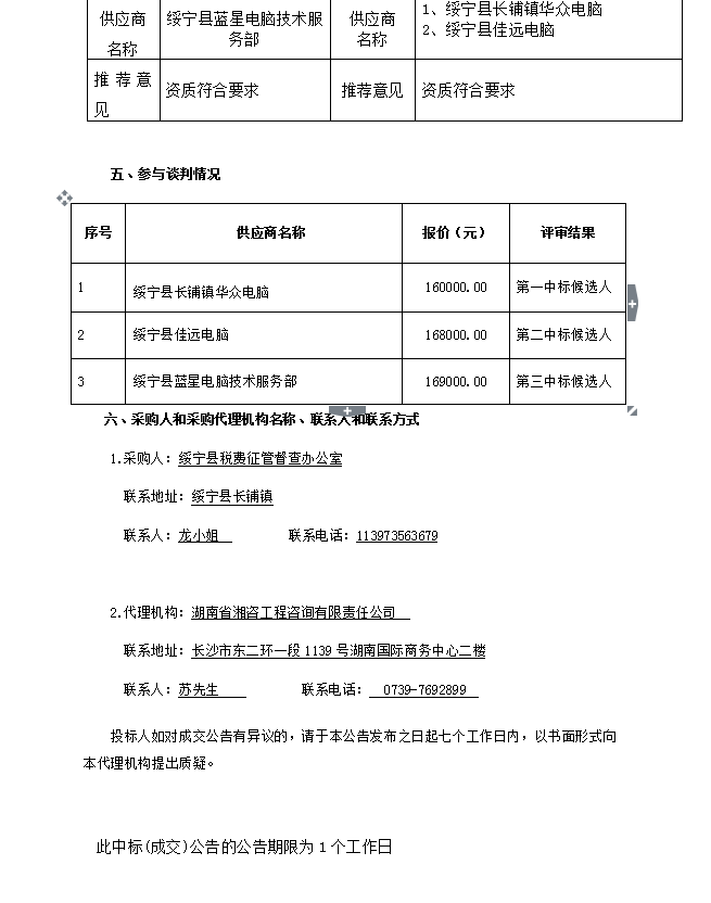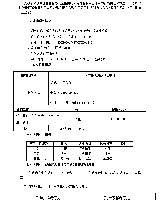 綏寧縣稅費征管督查辦公室平臺建設(shè)硬件采購談判成交公告
