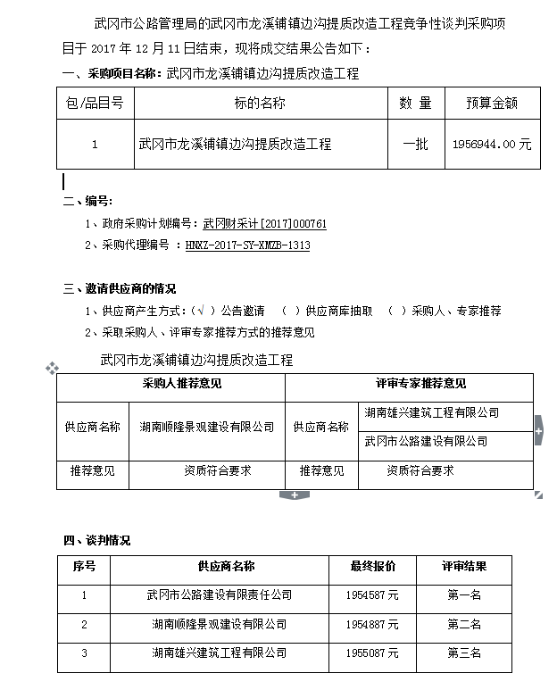 武岡市龍溪鋪鎮(zhèn)邊溝提質(zhì)改造工程 競(jìng)爭(zhēng)性談判成交結(jié)果公告