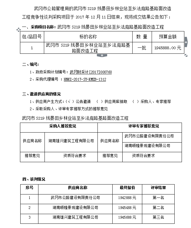 武岡市S219線晏田鄉(xiāng)林業(yè)站至鄉(xiāng)法庭路基路面改造工程競爭性談判成交結(jié)果公告