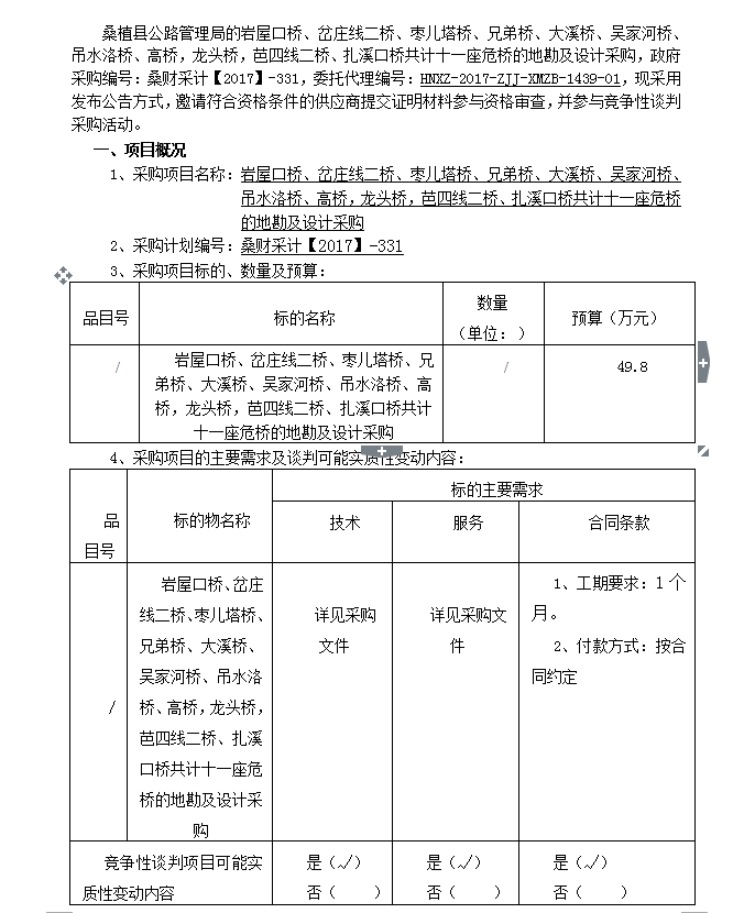 巖屋口橋、岔莊線二橋、棗兒塔橋、兄弟橋、大溪橋、吳家河橋、吊水洛橋、高橋,龍頭橋,芭四線二橋、扎溪口橋共計十一座危橋的地勘及設計采購 談判公告