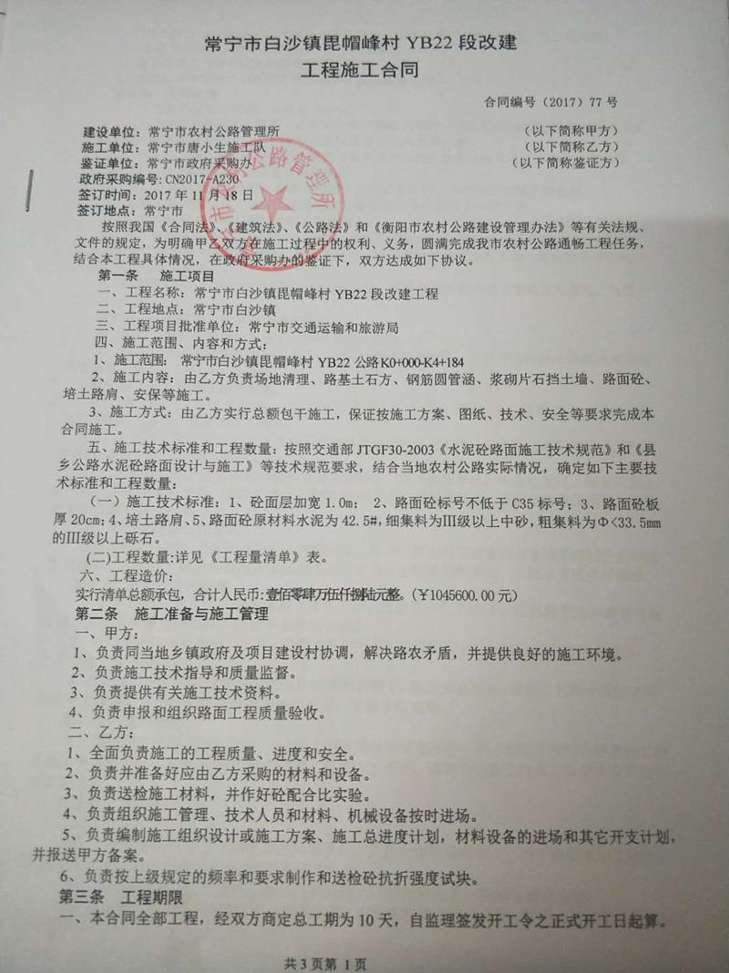 常寧市白沙鎮(zhèn)毘帽峰村YB22段改建工程合同公示