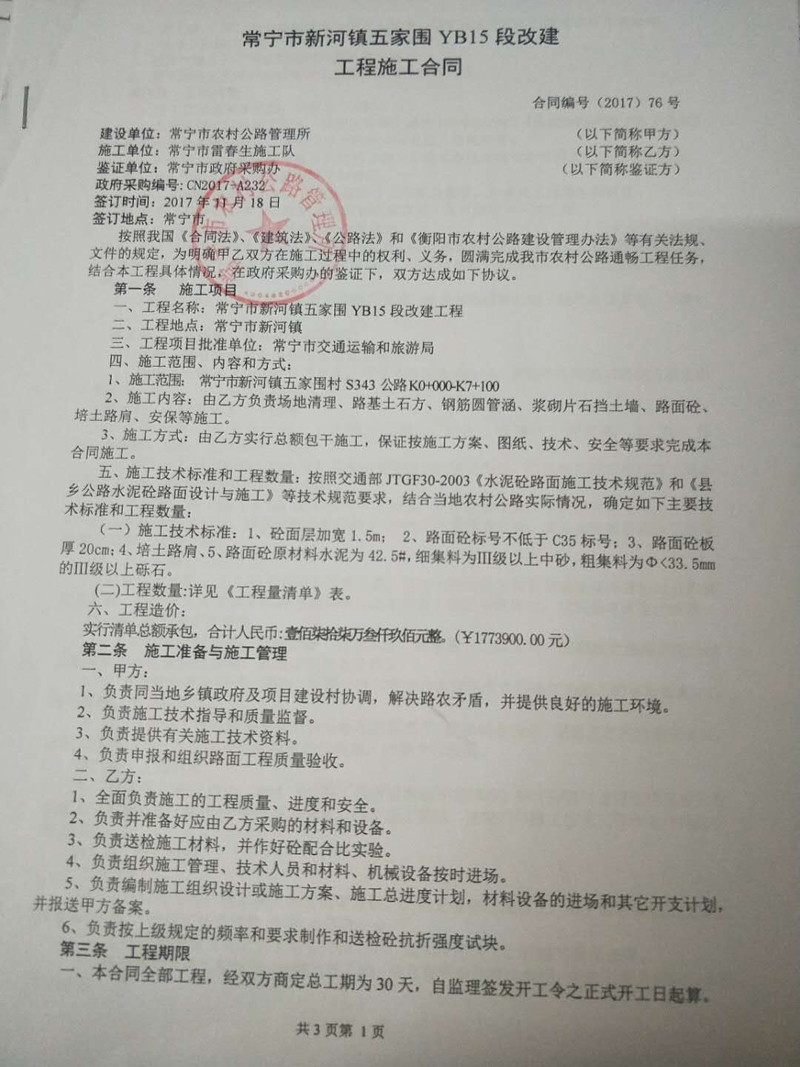 常寧市新河鎮(zhèn)五家圍村YB15段改建工程合同公示