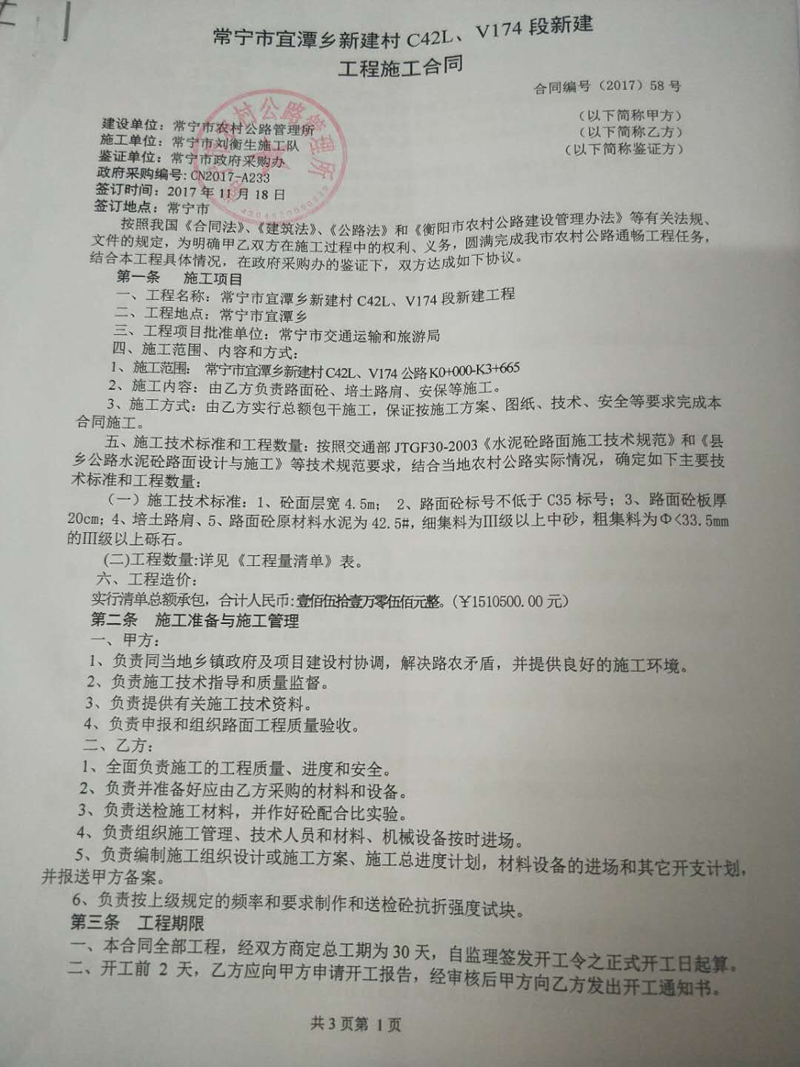 常寧市宜潭鄉(xiāng)新建村C42L、V174段新建工程合同公示