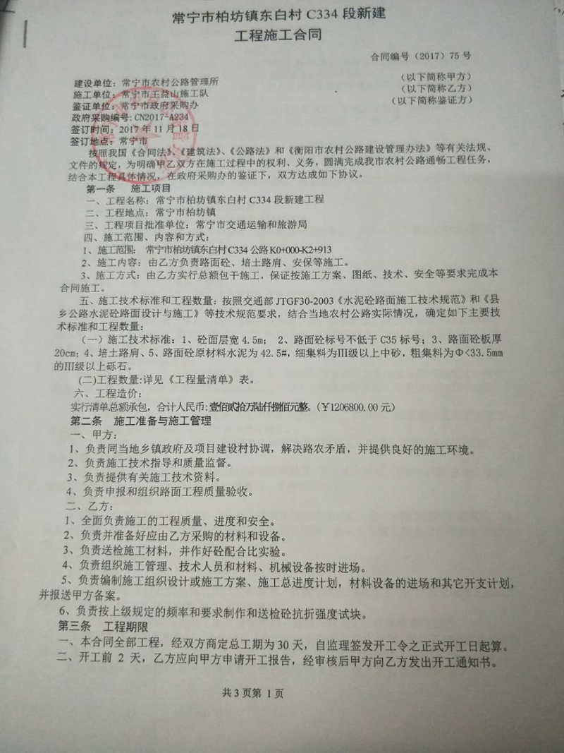 常寧市柏坊鎮(zhèn)東白村C334段新建工程合同公示