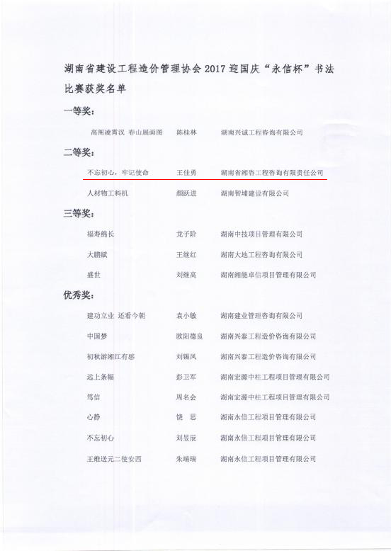 【喜訊】熱烈祝賀我司王佳勇在湖南省建設(shè)工程造價管理協(xié)會2017年 “永信杯”書法比賽獲得二等獎