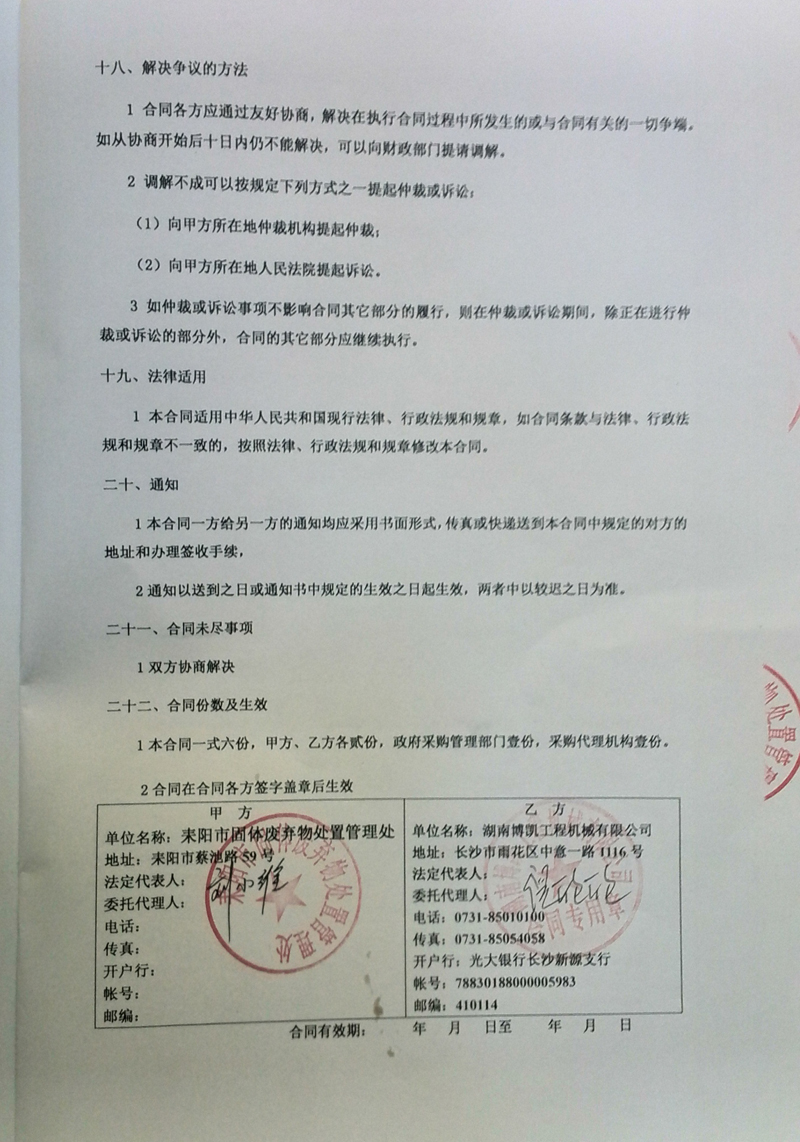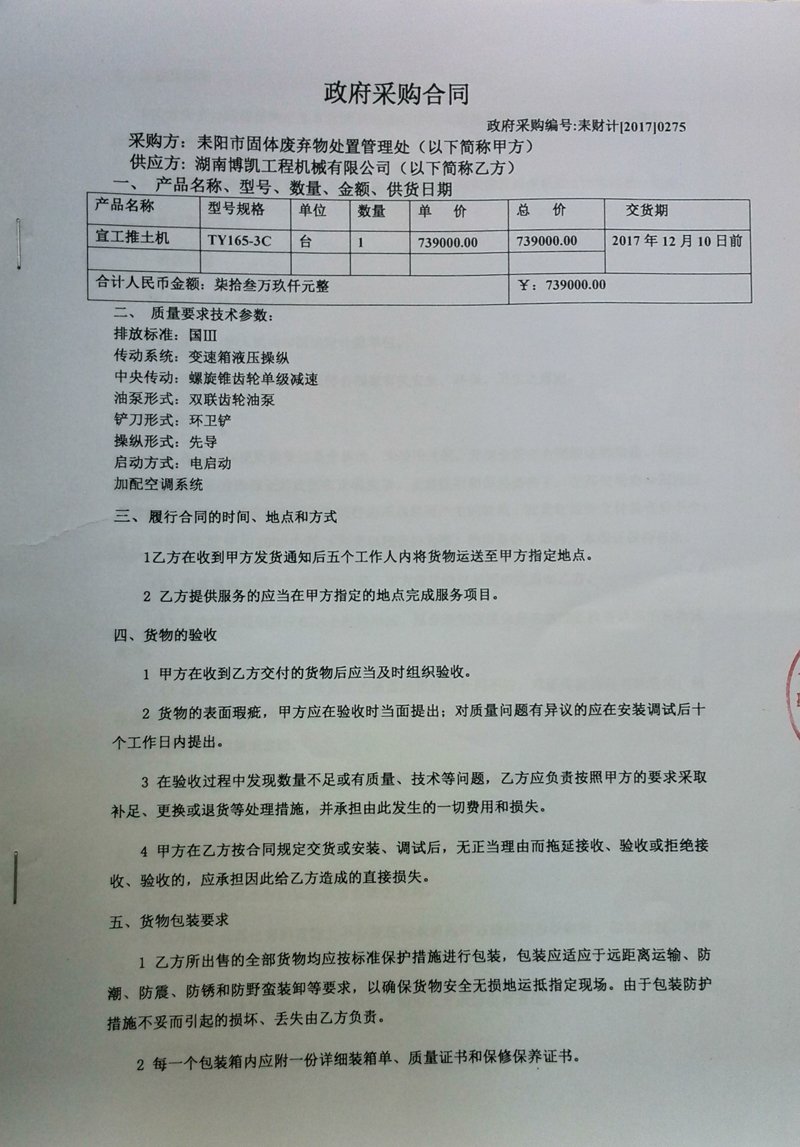 耒陽市固體廢棄物處置管理處推土機(jī)(環(huán)衛(wèi)型)合同公示