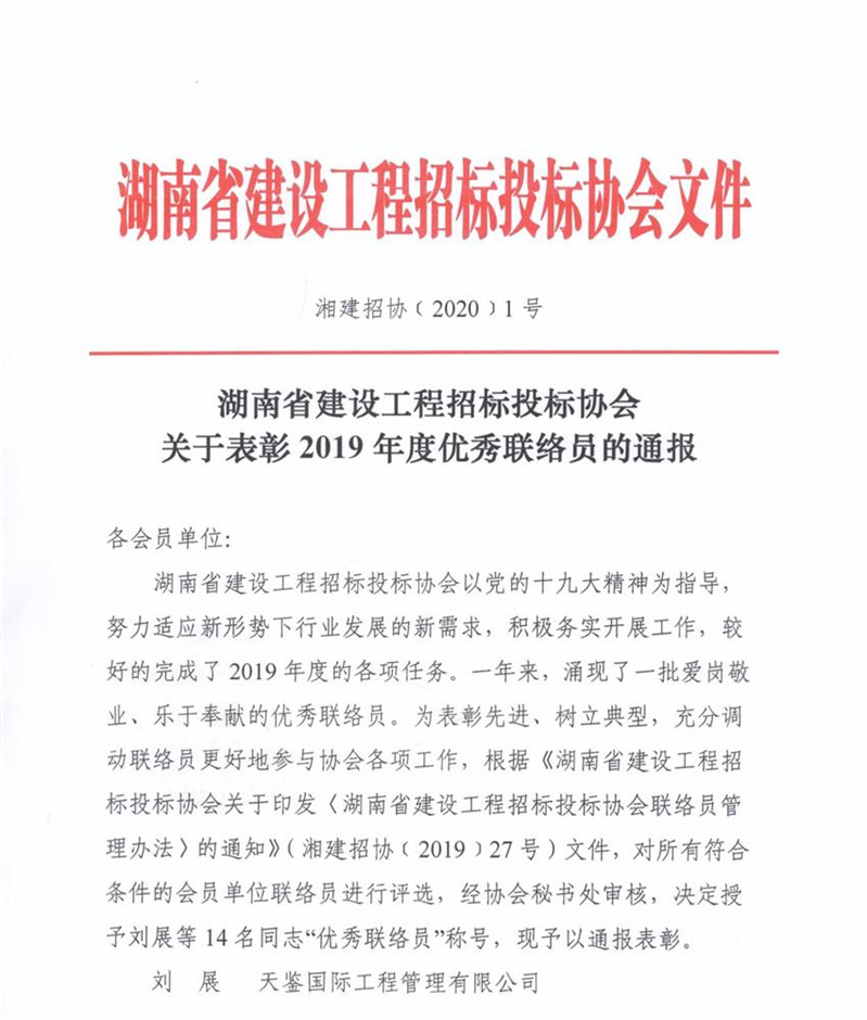 【喜訊】熱烈祝賀我司劉輝獲評湖南省建設(shè)工程招標(biāo)投標(biāo)協(xié)會(huì)2019年度優(yōu)秀聯(lián)絡(luò)員