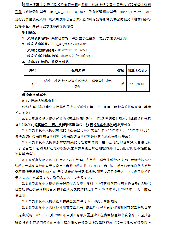 梨樹山村堆上組安置小區(qū)給水工程競(jìng)爭(zhēng)性談判采購(gòu)公告
