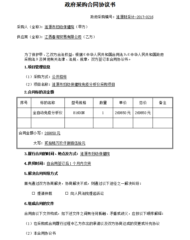 漣源市婦幼保健院免疫分析儀采購項目政府采購合同公示