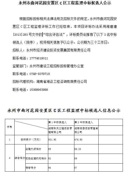 永州市曲河花園安置區(qū)C區(qū)工程監(jiān)理中標(biāo)候選人公示